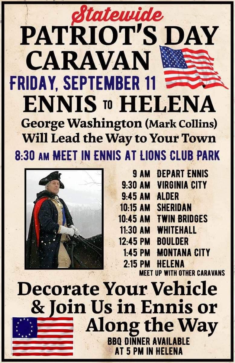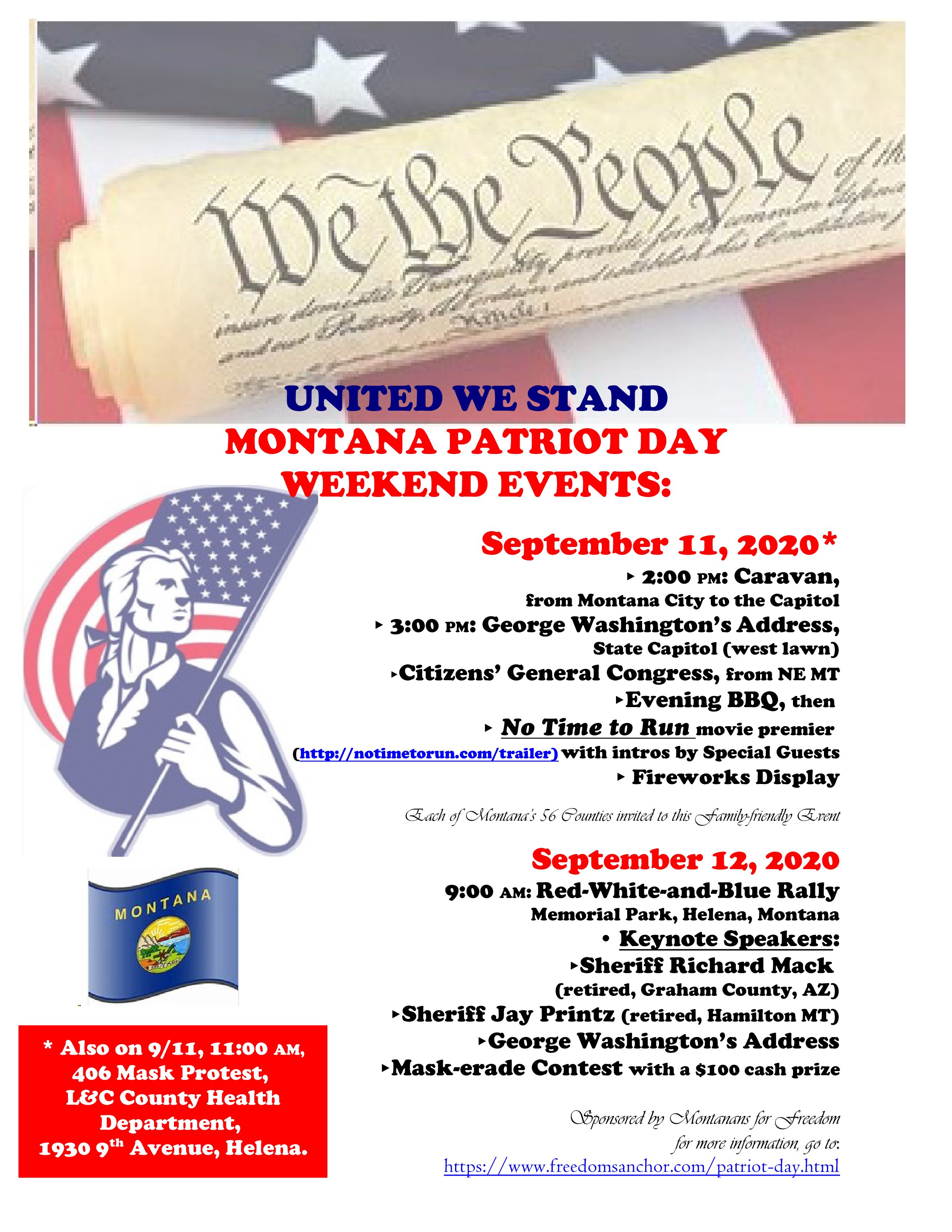 Come together for a Patriot Day celebration! Patriots from all over Montana and outside the state will come together on September 11 and 12, 2020. We will be celebrating and securing our Constitutionally protected, God-given rights. Make sure all 56 Montana counties are represented! See agenda below.